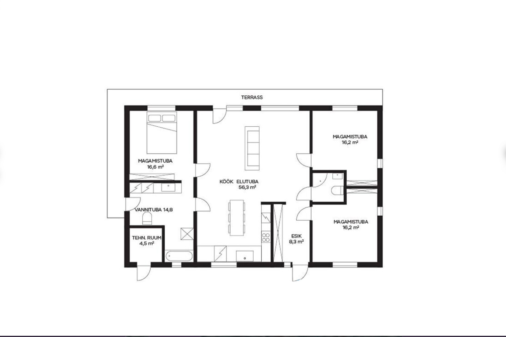 – Avar 56,3 m² elutuba-köök, kust pääseb õhtupäikesele avanevale terrassile
