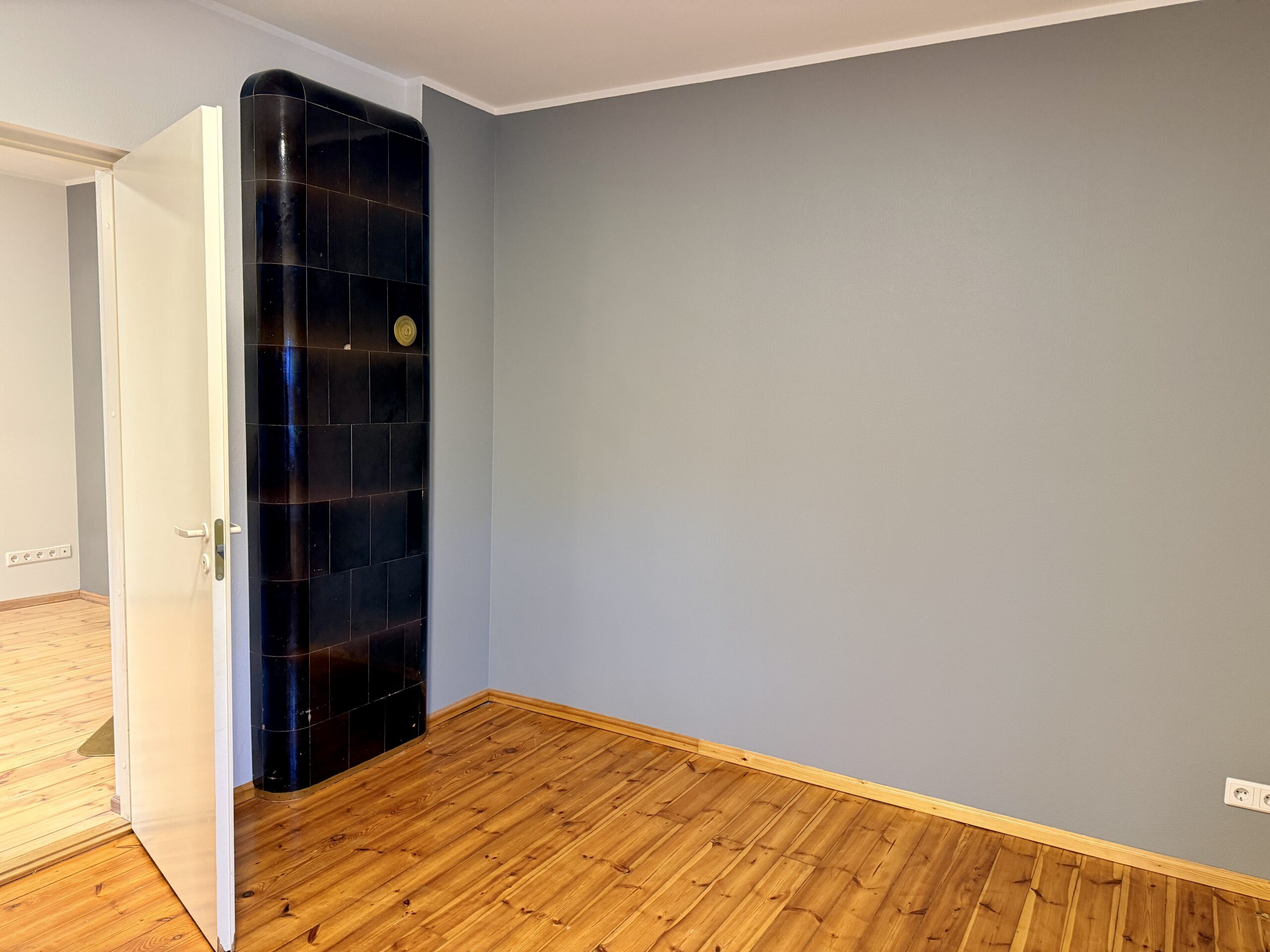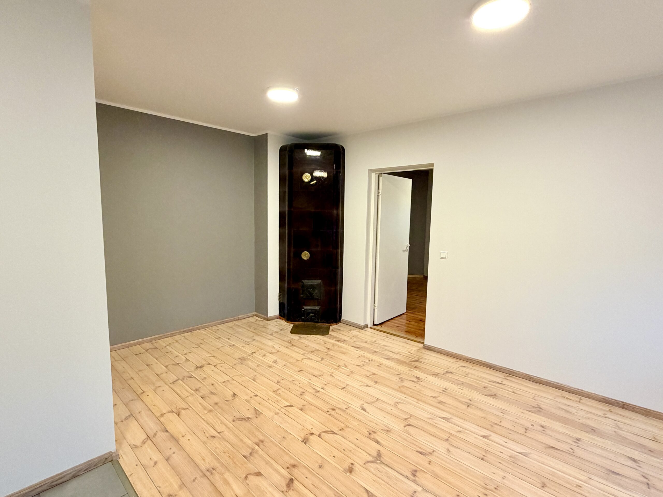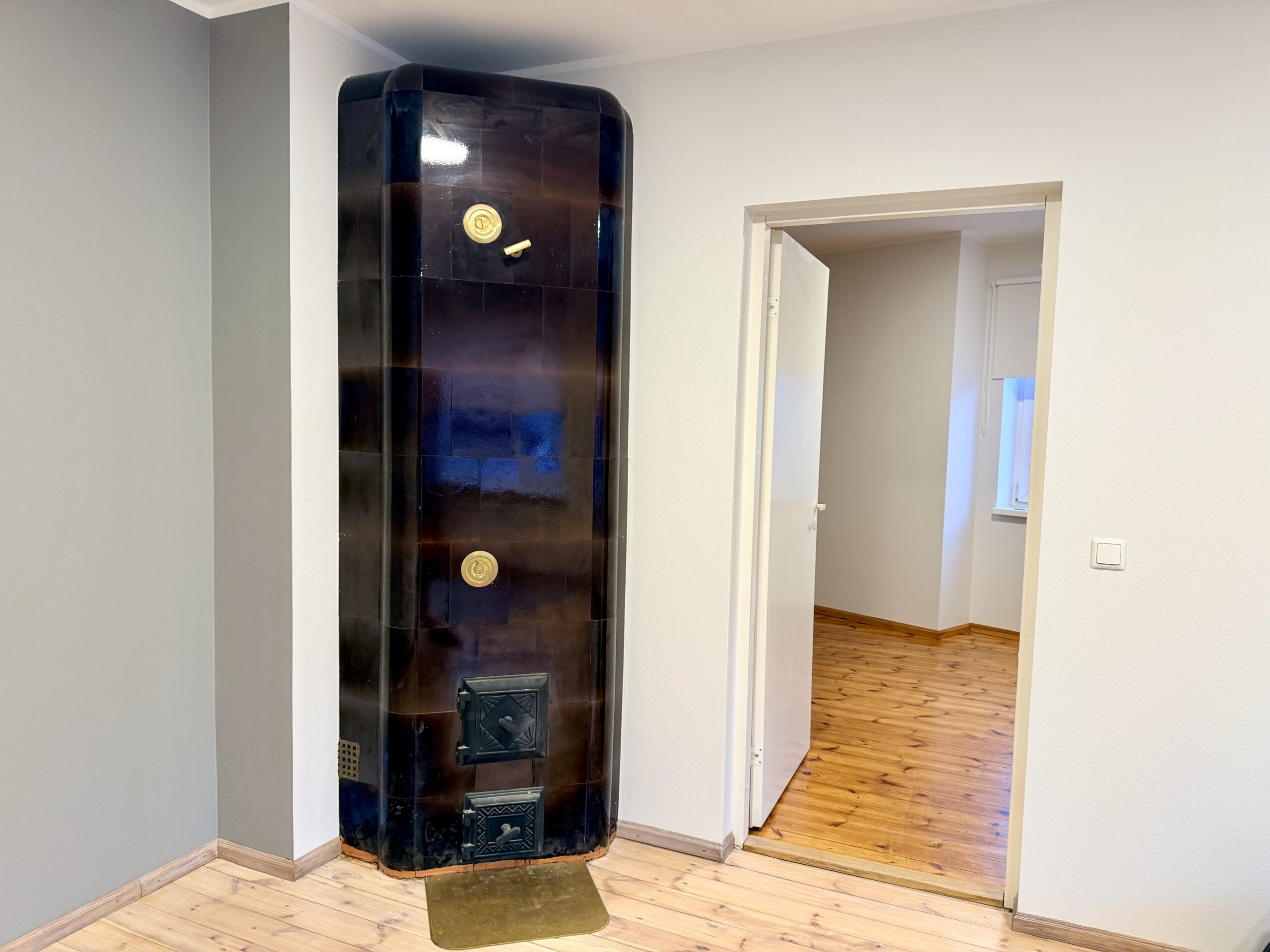 The main heating source of the apartment is electric heating, complemented by a wood-burning stove. The stove’s ceramic-tiled heat-retaining walls extend into both rooms, which helps keep heating costs under control if desired and creates a comfortable indoor climate.