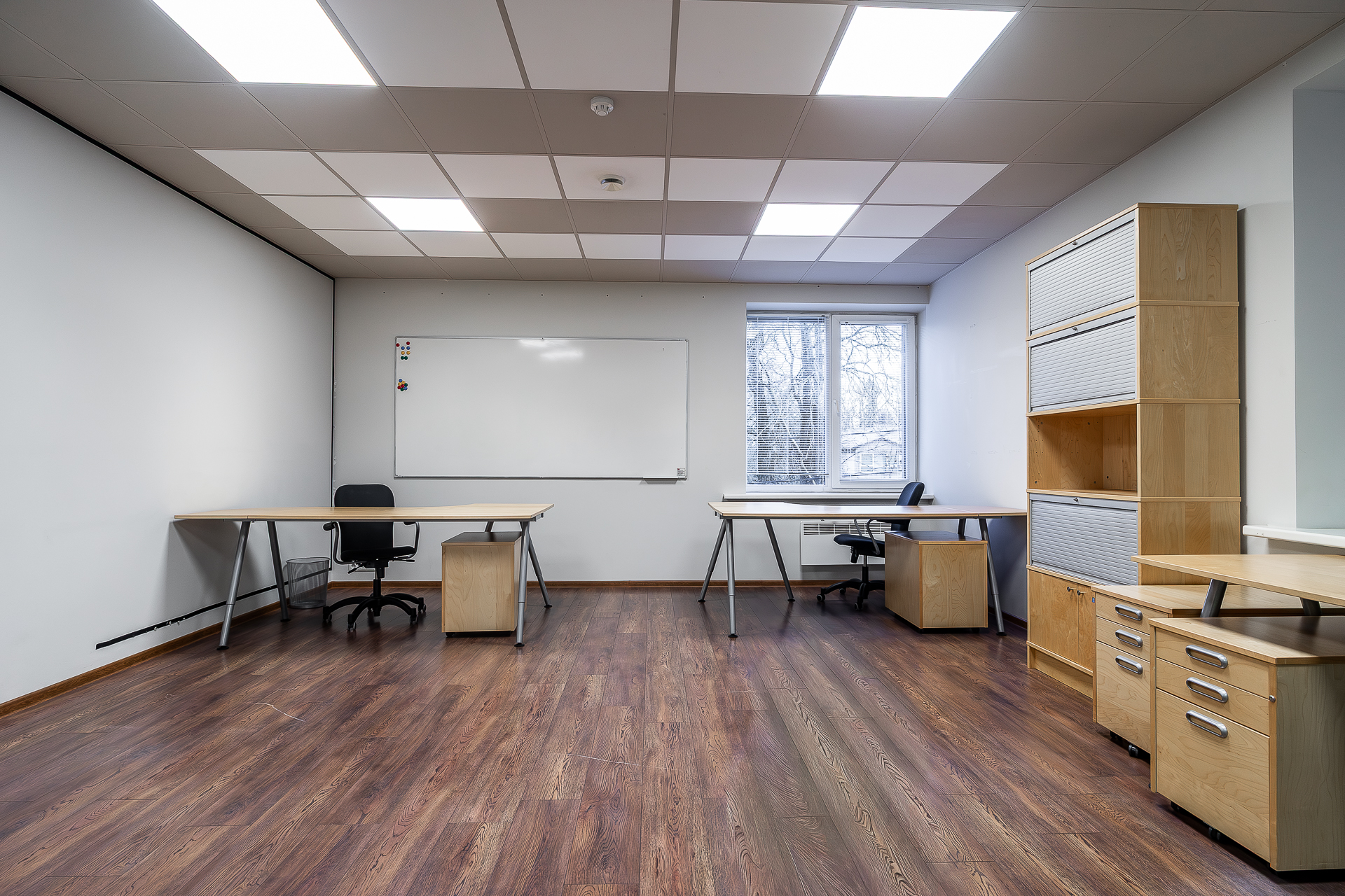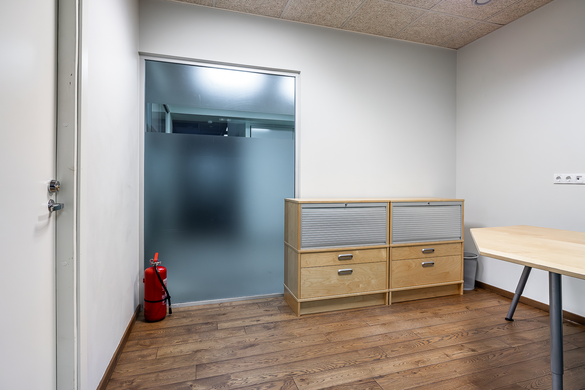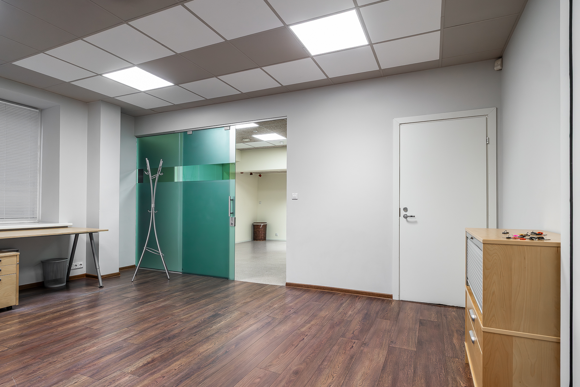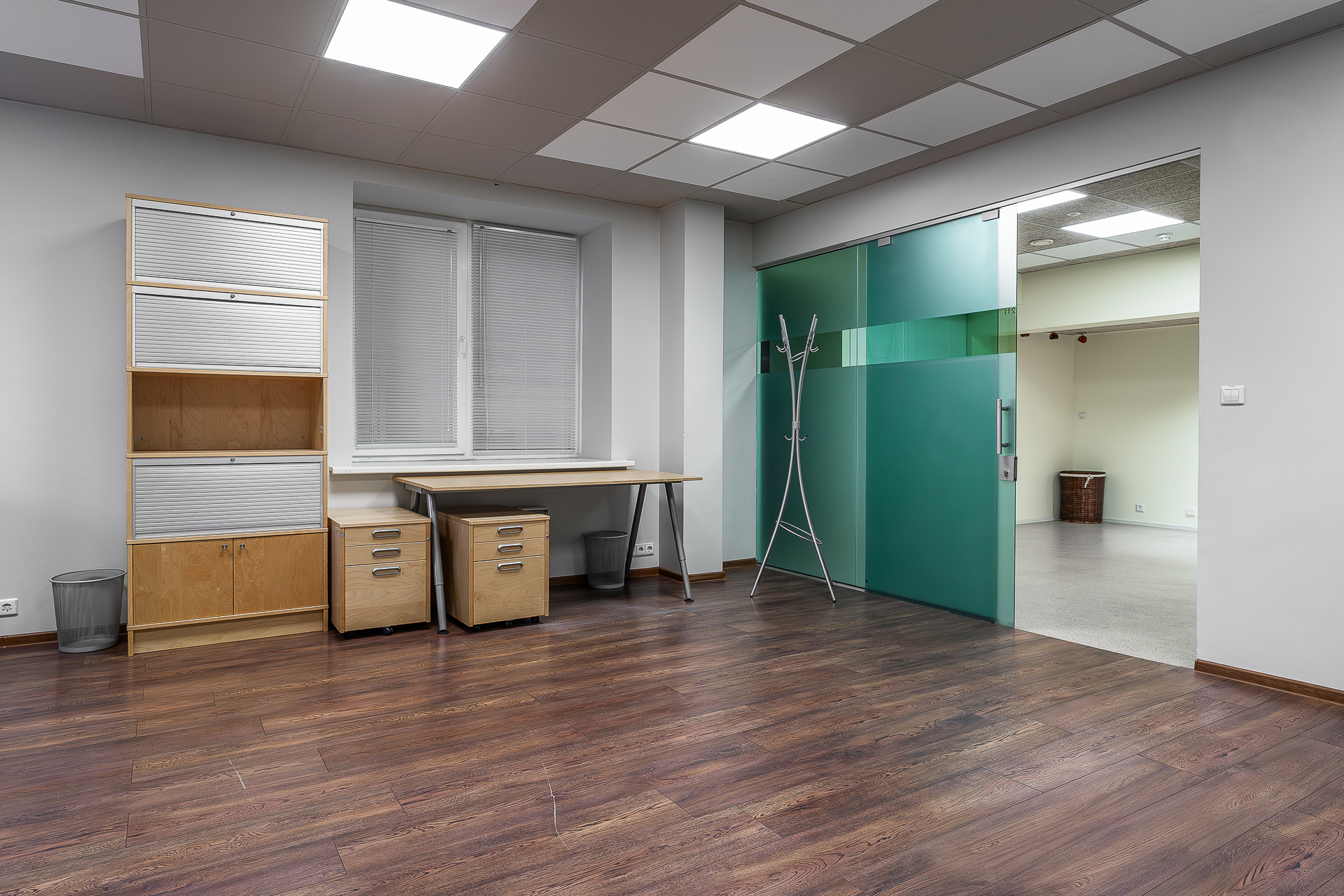 Teisel korrusel paiknev büroo on mattklaasist vaheseintega. Fotodelt näha olev mööbel – töölaudade komplektid, rulluksega kapid ja ratastel sahtliboksid – jääb üürniku kasutusse ning pakuvad mugava võimaluse koheselt tööga alustada.