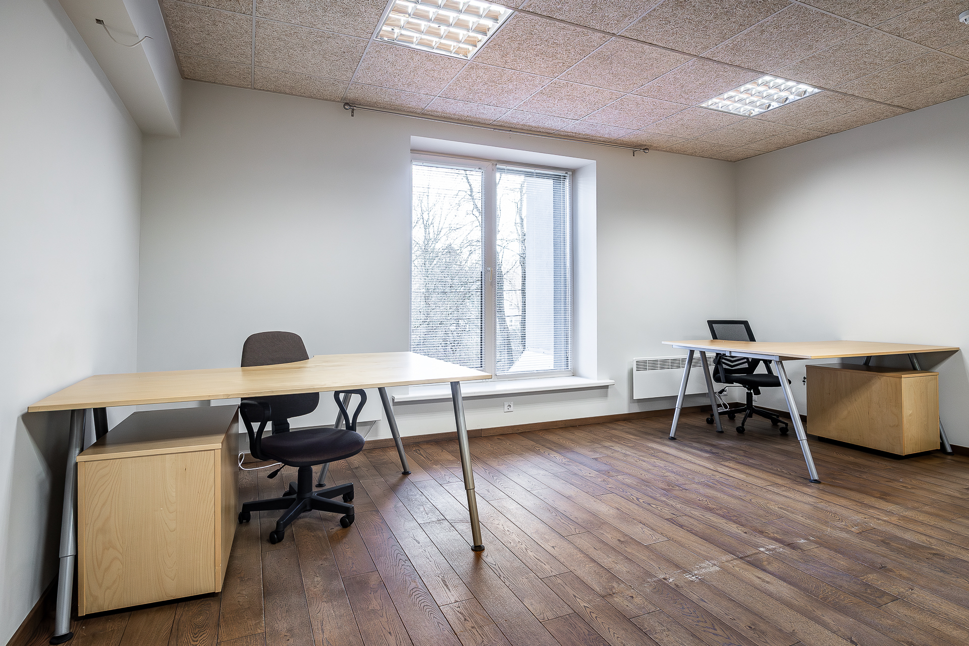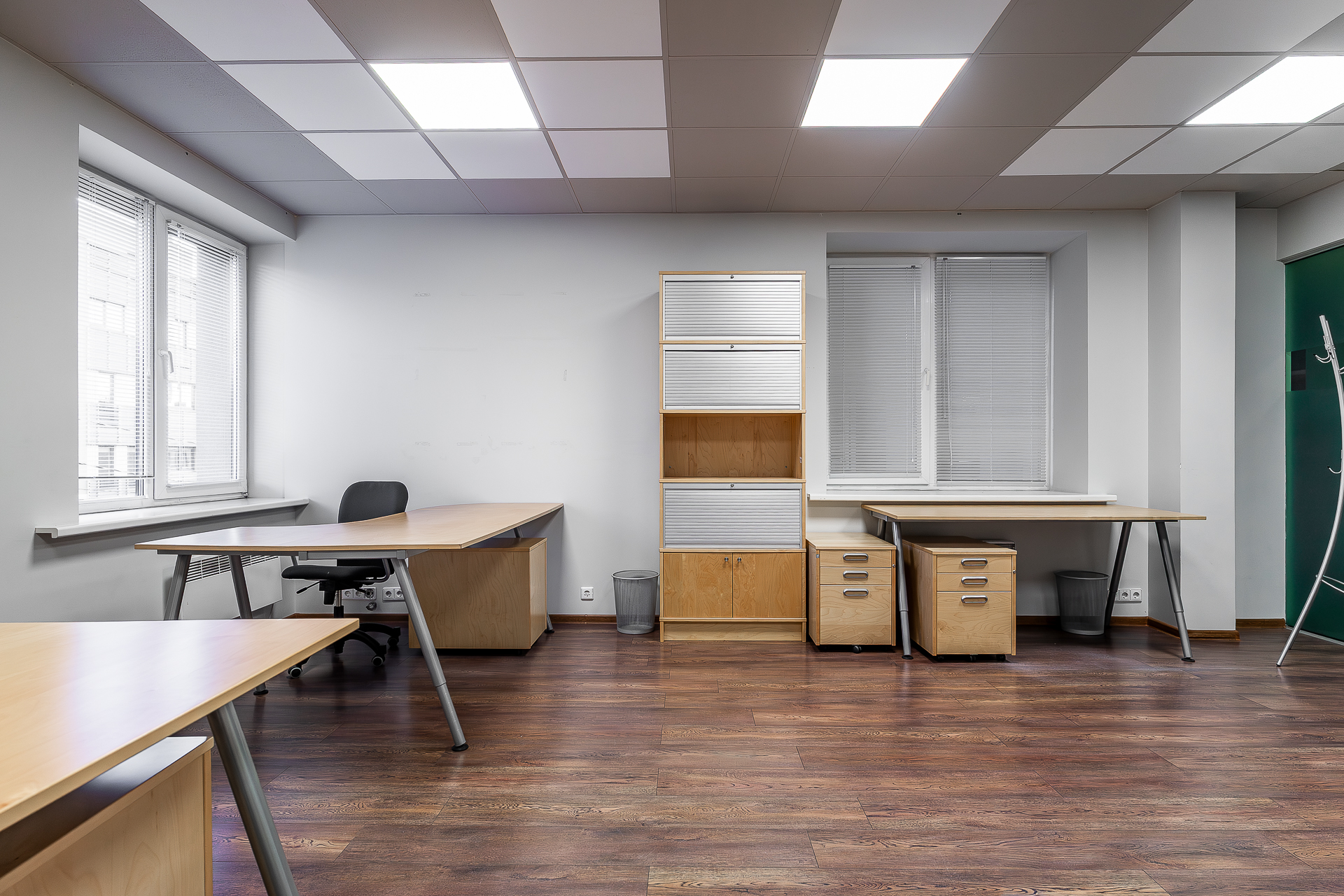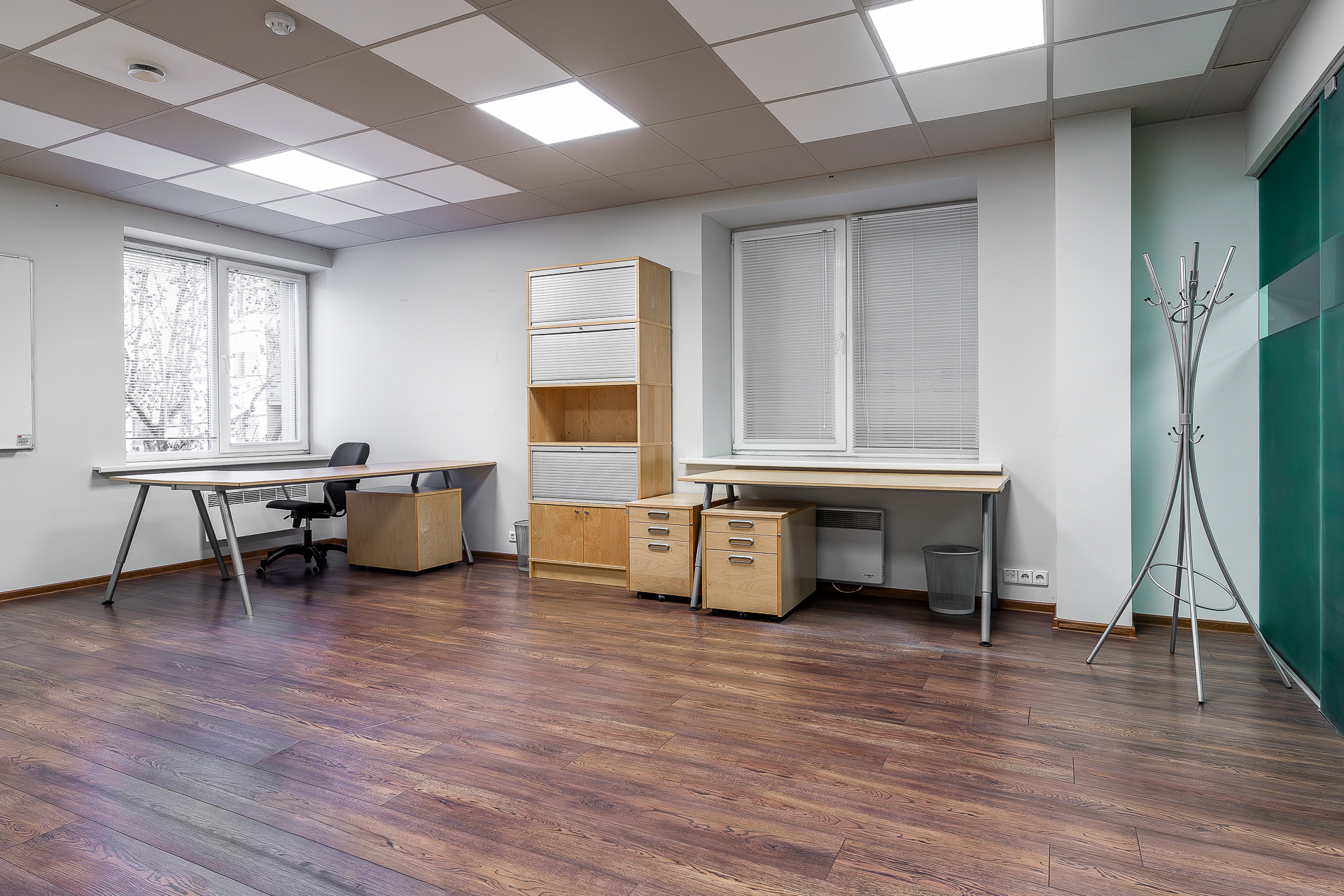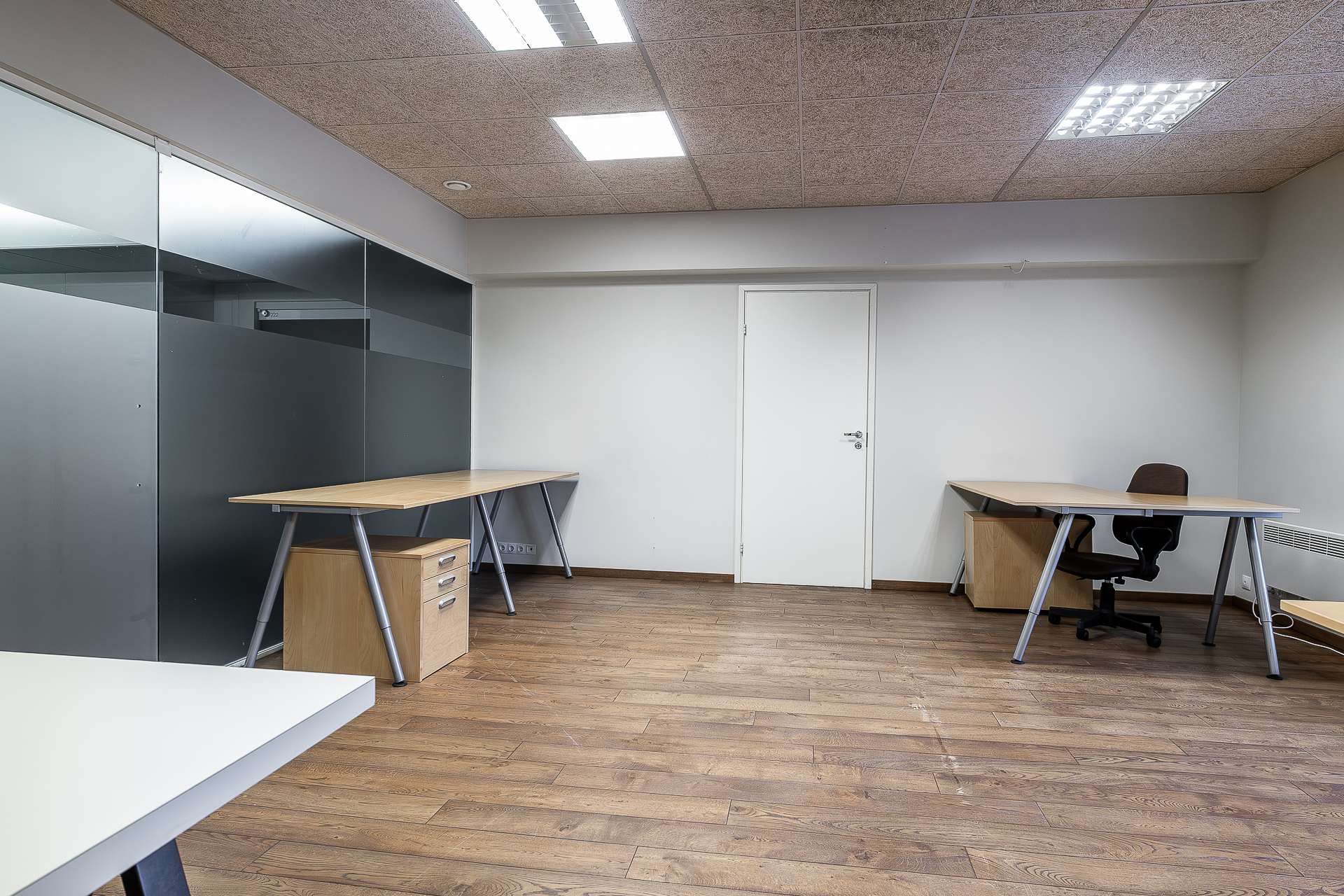 Teisel korrusel paiknev büroo on mattklaasist vaheseintega. Fotodelt näha olev mööbel – töölaudade komplektid, rulluksega kapid ja ratastel sahtliboksid – jääb üürniku kasutusse ning pakuvad mugava võimaluse koheselt tööga alustada.
