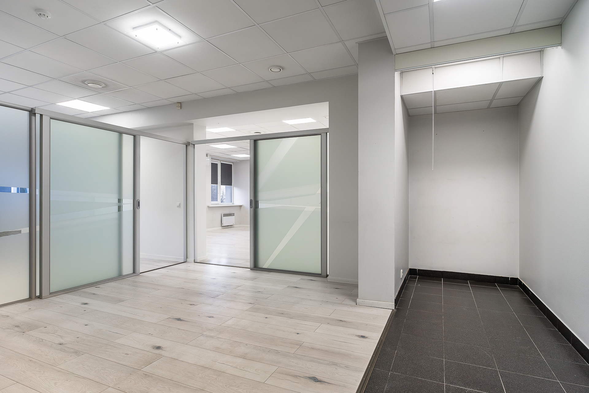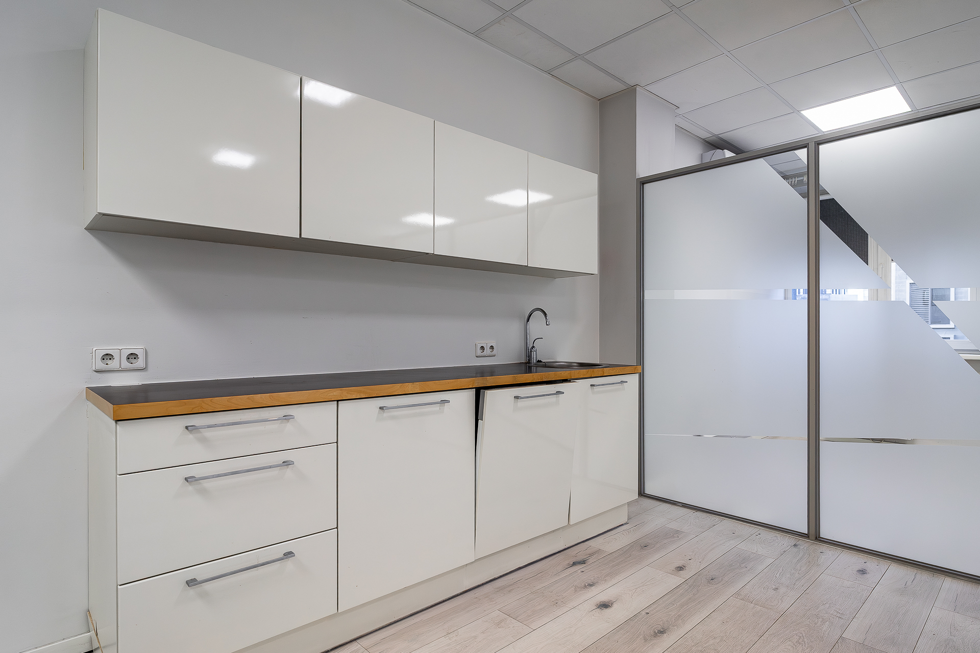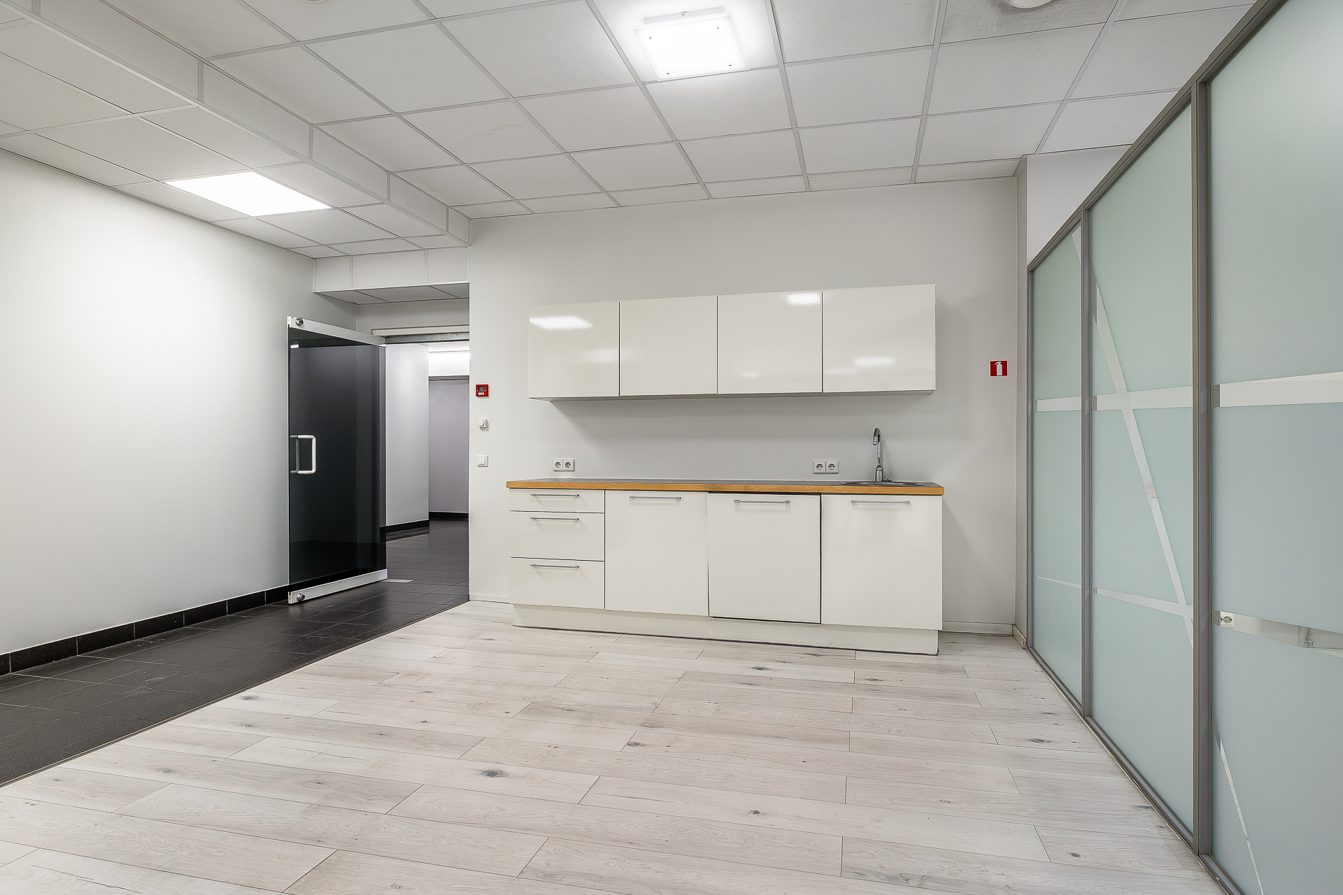 Büroo asub hoone teisel korrusel. Planeering pakub tasakaalu avatud töökeskkonna ja privaatsemate ruumide vahel. Fotodelt näha olevad matist klaasist liuguksed võimaldavad ruume vajadusel mugavalt eraldada. Büroos on olemas ka köögiala lahendus. Ruumid on hea loomuliku valgusega. Heledad seinad muudavad interjööri avaraks ja neutraalseks.